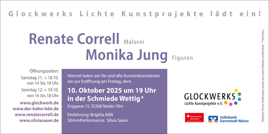 Meine neuesten Arbeiten stelle ich ab Freitag, den 10. Oktober 2025 zusammen mit der Künstlerin Monika Jung in der Schmiede Wettig in Nieder-Olm aus. Die Vernissage startet um 19 Uhr mit Silvia Sauer- performing voice!